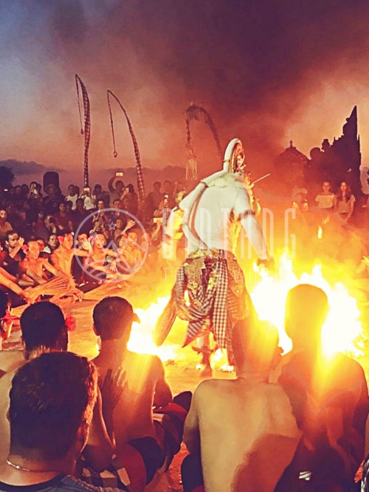 울루와뚜 사원의 선셋을 배경으로 발리 전통 댄스 '깨작댄스' 공연을 관람합니다. 수십 명의 남자 무용수가 중앙을 향해 둥글게 모여 앉아 손을 들고 깨짝깨짝 소리를 내며 공연을 해서 깨짝댄스라고 합니다. 사원의 제례무용으로 신이 내려 최면 상태에서 추는 춤이었던 깨짝댄스는 인도의 고대 서사시 라마야나의 전설을 접목해 공연으로 만들어졌습니다. 신들린 댄서가 불 위를 맨발로 올라가서 추는 불의 춤이 절정입니다.